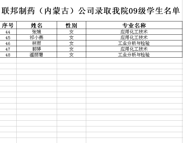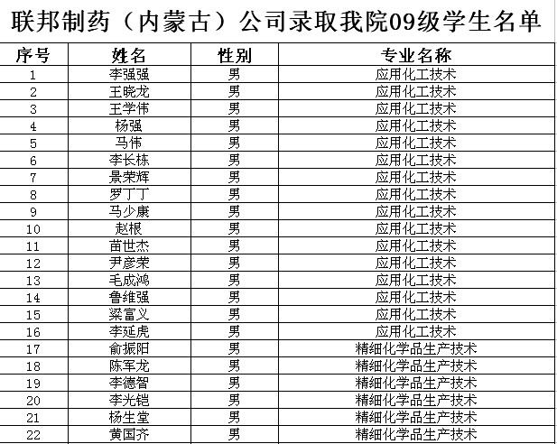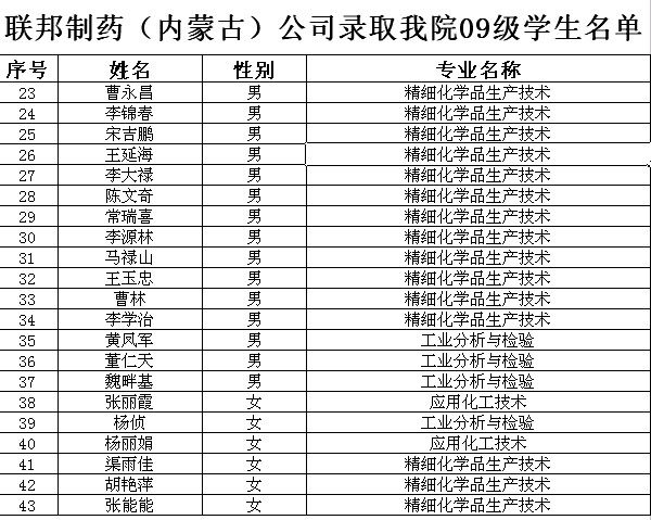 联邦制药内蒙古有限公司录用公司09级员工名单
