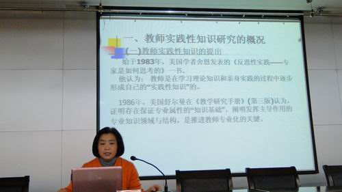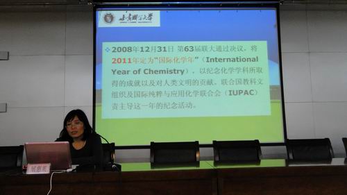五位教师结合自己近年来的研究成果为大家献上了一顿难得的盛宴。李欣教授做了题为“用于蛋白质药物靶向传输的多糖载体的化学修饰与性质研究”;杨春文副教授做了题为“五元杂环化合物农药的研究进展”;王传娥副教授做了题为“化学教师实践性知识的研究――以化学教育专业老员工培养为例”;展惠英副教授做了题为“绿色化学的形成、现状和发展趋势”;姜立萍副教授做了题为“防腐蚀涂料”的学术报告。