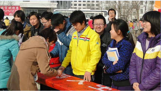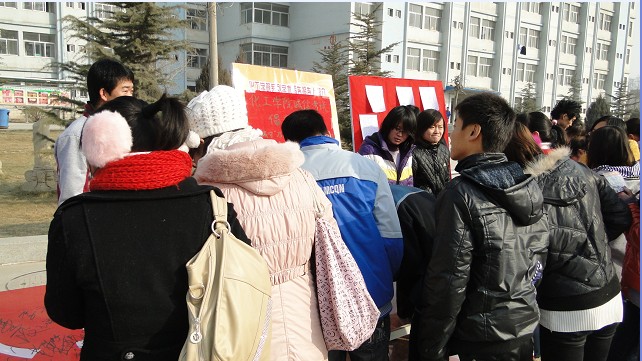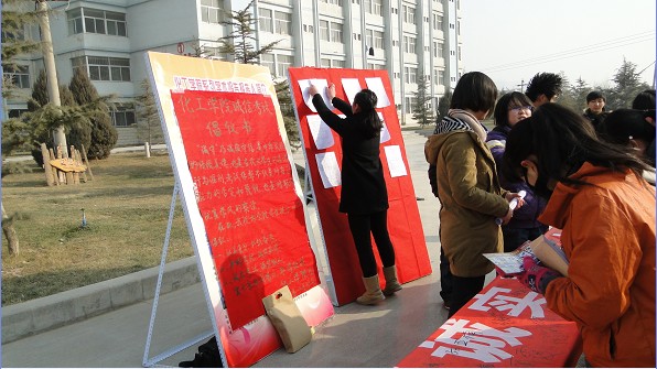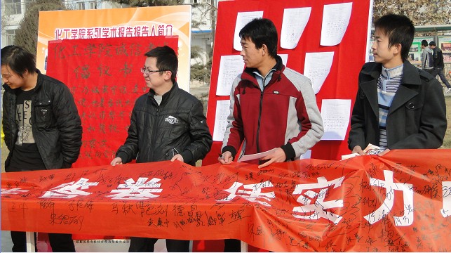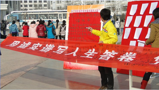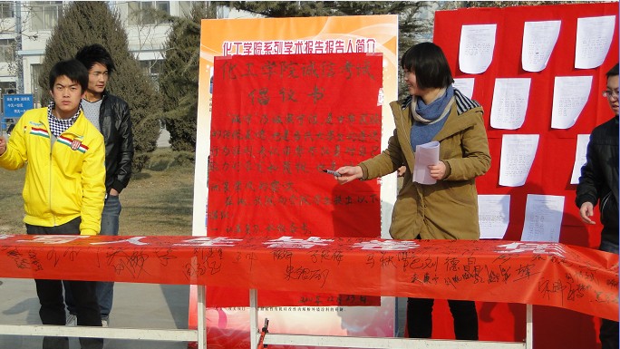 (三)12月22日,开展了诚信考试签名活动,员工们在横幅和各班级印制的签名书上纷纷签了名,表示要诚信考试,杜绝作弊。