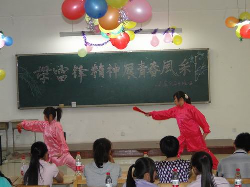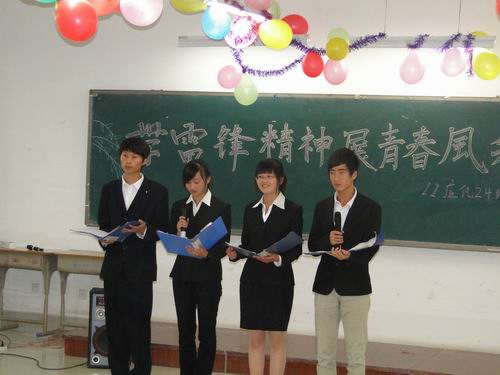 晚会以诗歌朗诵《学雷锋》暖场,随后的歌曲《勇敢的幸福》,引爆全场观众的阵阵欢笑声,太极扇表演更是吸引了在座观众的眼球,11级应化2班三位女生表演的武术《集体拳》赢得了在场观众的热烈掌声。在节目进行中,穿插了与台下同学回答雷锋语录的互动,将晚会推向了高潮,晚会在一曲《我们都是好孩子》中圆满结束。
