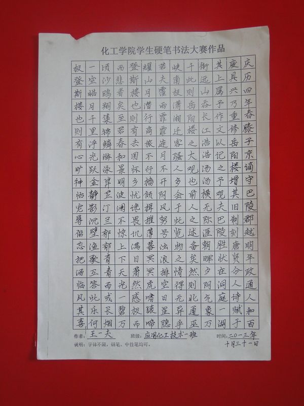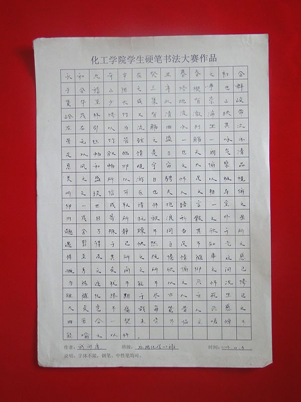 在当今电脑广泛应用的今天,老员工的书写能力下降明显,为了提高公司员工的汉字书写水平,挖掘、培养硬笔书法人才,公司员工会于2013年10月29日至11月13日举办了硬笔书法大赛。
