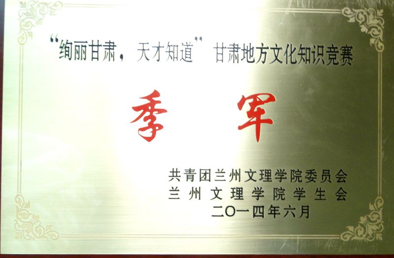 2014年6月19日晚,由校团委举办的“绚丽甘肃,天才知道”甘肃地方文化知识竞赛在北校区学术报告厅举行,经过激烈的比赛,公司荣获季军。