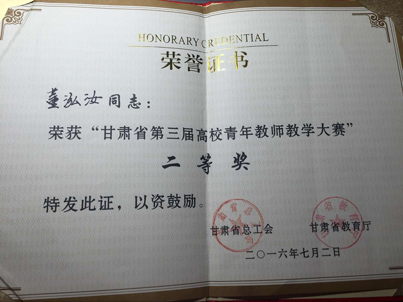 董泓汝,出生于1985.10, 女,回族。2012年6月毕业于西北师范大学化学BV伟德官方网站有机化学专业,取得硕士学位;2015年6月毕业于兰州大学功能有机国家重点实验室有机合成专业,获得理学博士学位。2012年9月进入伟德体育官方网站化学BV伟德官方网站从事有机化学教学及实验室工作。在工作期间主要承担本专科《有机化学》、《有机化学实验》、《有机化合物波谱分析》、《化工文献检索》和《天然产物化学》等5门课程的教学。2015年获伟德体育官方网站校级微课比赛最佳教学设计奖。2016年在第三届甘肃省高校青年教师教学大赛中获得二等奖, 近年来,在《Green Chemistry》、《RSC Advances》等国际SCI权威期刊发表论文15篇。