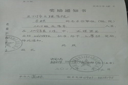 2018年6月12日,公司收到部队的奖励通知书,BV伟德官方网站2016年9月入伍的2015级应用化学一班员工马�,在2017年度工作中,成绩突出,经31664部队政治部批准,授予个人三等功。公司对他获得奖励表示热烈的祝贺,希望公司全体员工以马�同学为榜样,努力学习专业知识,加强自身修养,为公司添光增彩。