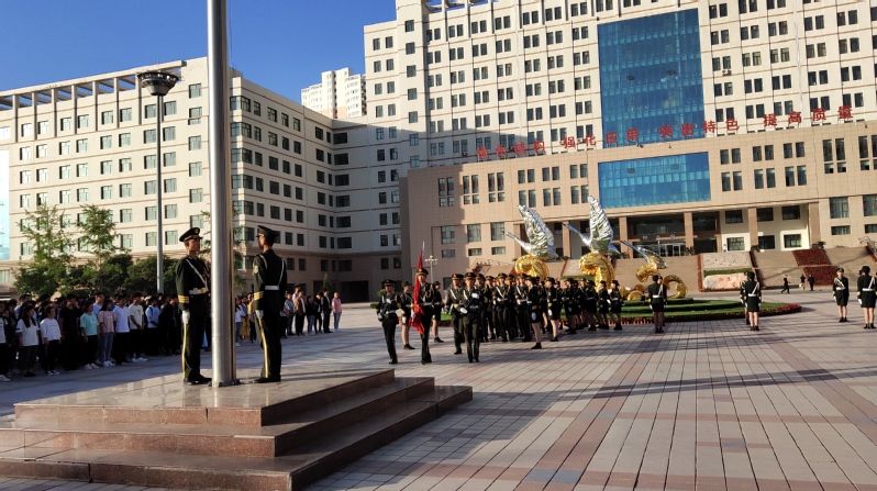 升旗仪式前,全体师生有序列队,注视公司国旗护卫队队员迈着整齐的步伐,护送国旗。七时整,伴随着雄壮激昂的义勇军进行曲,鲜艳的五星红旗在国歌声中迎着旭日冉冉升起,五星红旗迎风飘扬,全体师生行严肃的注目礼。