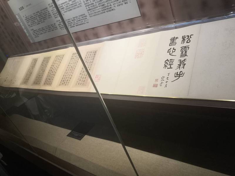然后在讲解员的带领下,参观了赵孟頫行书《般若波罗蜜多心经》、唐寅、仇英等十二名家山水人物《明人金笺扇集册》、齐白石《双寿图》、傅抱石《茅山雄姿》、文渊阁版《四库全书》、《清敕修大藏经》原经板刷印本等珍贵藏品,所有的珍品让同学们应接不暇,感受着中国传统文化带给我们震撼!