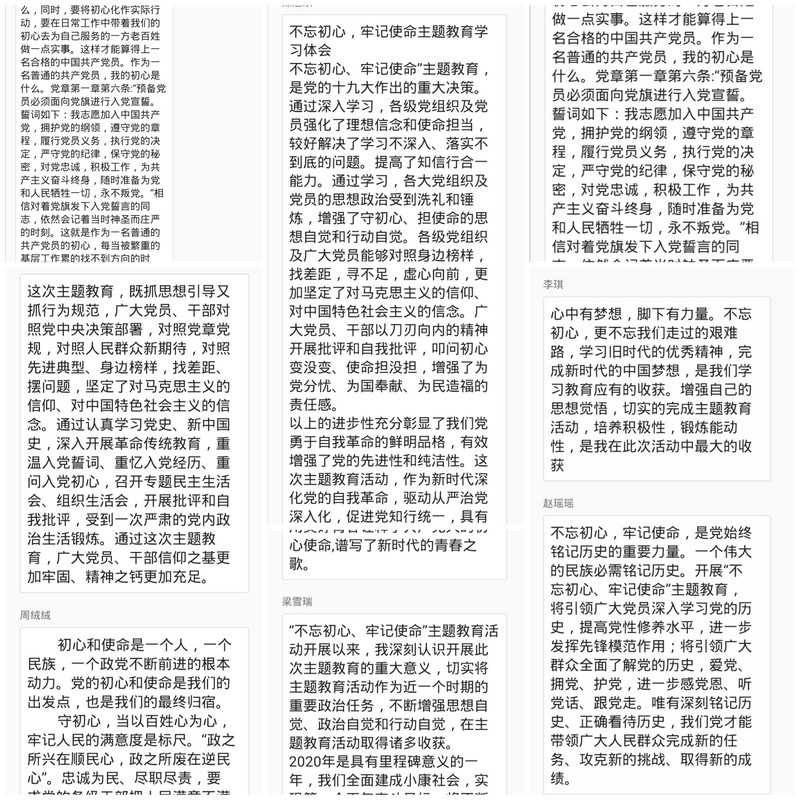 全体党员展开了一系列的学习和研讨交流,大家踊跃发言。员工党员李琪谈到了他的学习收获:心中有梦想,脚下有力量。不忘初心,更不忘我们走过的艰难路,学习旧时代的优秀精神,完成新时代的中国梦想,是我们学习教育应有的收获。增强自己的思想觉悟,切实的完成主题教育活动,培养积极性,锻炼能动性,是我在此次活动中最大的收获。员工党员赵瑶瑶则是对党员的带头作用进行了阐述:不忘初心,牢记使命,是党始终铭记历史的重要力量。一个伟大的民族必需铭记历史。唯有深刻铭记历史、正确看待历史, 我们党才能带领广大人民群众完成新的任务、攻克新的挑战、取得新的成绩。