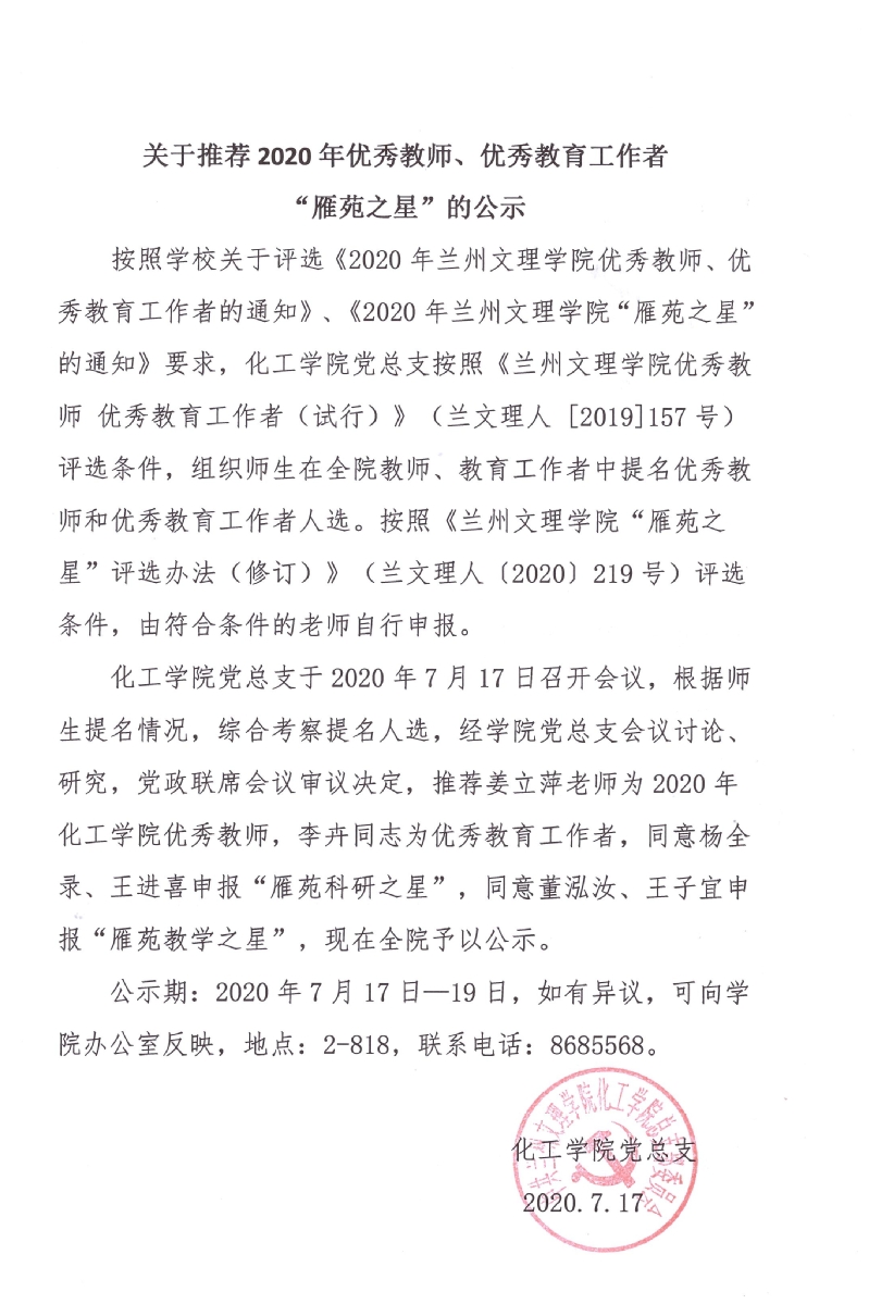 关于推荐2020年优秀教师、优秀教育工作者、“雁苑之星”的公示