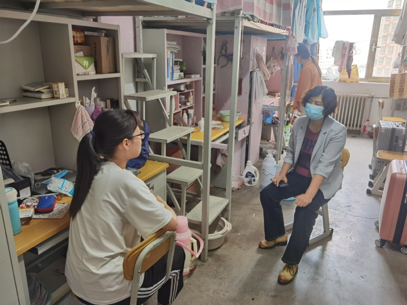 贺志军首先看望了身体不适的19级应用化学2班张蕾蕾同学,详细了解了她的身体状况,返校前的行动轨迹以及接触人员,叮嘱她注意休息。随后前往员工寝室,了解员工们的到校情况和寝室的卫生状况,提醒大家增强自身防护的意识,保持寝室整洁,多通风,做好常态化疫情防控工作,叮嘱大家如在学习、生活中遇到困难要及时向班主任和辅导员反映。