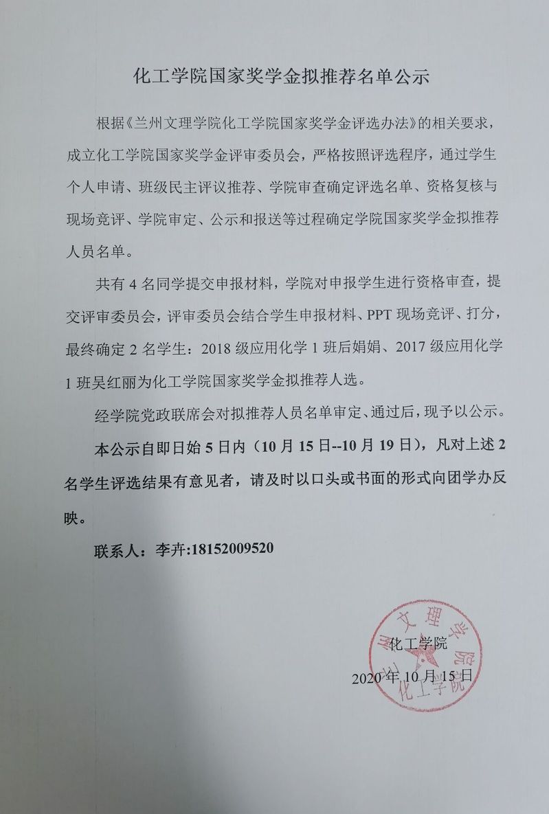 BV伟德官方网站国家奖学金拟推荐名单公示