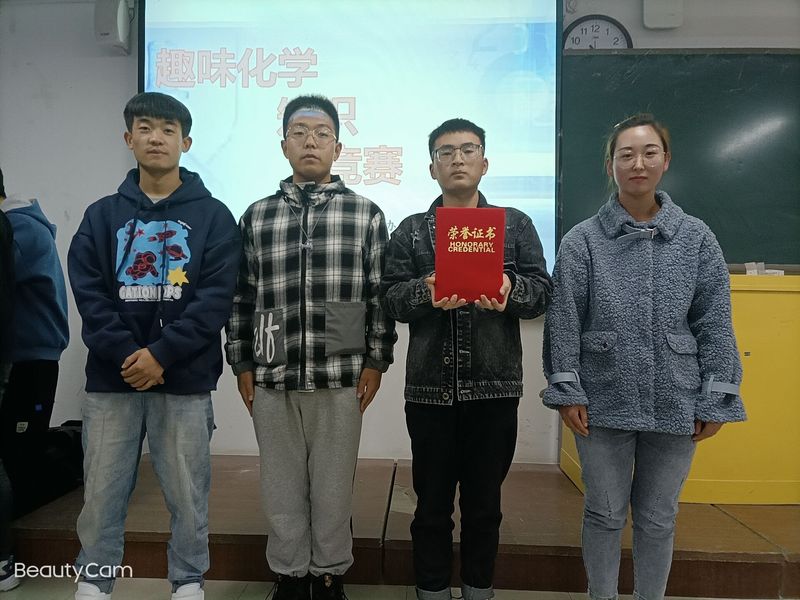 本次化学知识竞赛分为两轮:个人赛和团体赛,每班选拔3名参赛人员,绿色化学科技协会选拔9人参赛,共16支团队。各个班级实力强大,16组参赛队伍毫不示弱,你追我赶。尤其在决赛的抢答题上,各组选手把握最后的反超机会,争先恐后的进行答题,赢得现场不断的掌声。最终20级化工一班团队凭借雄厚的专业知识、超于他人的冷静答题,赢得评委以及现场观众的一致认可,获得团体赛冠军称号。徐志蓉凭借其精彩的现场表现,全面具体的答题方式,赢得个人赛冠军。最后,在各位观众的掌声中,本次活动拉下帷幕。
