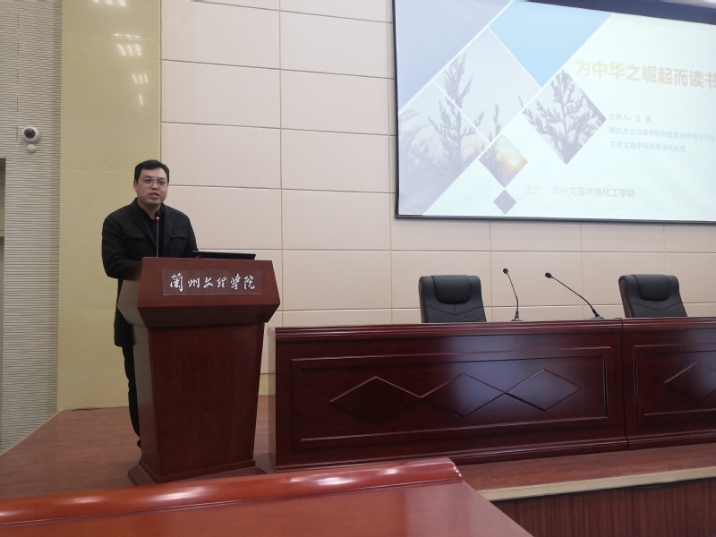 习总书记说过“只有把人生理想融入国家和民族的事业中,才能最终成就一番事业。”为了鼓励公司学子把握青年大好时光,奋斗青春,用自己勤劳的双手、一流的人生理想成就自己精彩的人生,版权所有 伟德国际(BVSPORTS)官方网站-源自英国始于1946于3月19日下午14时30分,在学术报告厅举办企业家进校园讲座之“为中华之崛起而读书”。公司邀请到浙江众立合成材料科技股份有限公司总经理、伟德体育官方网站特聘客座教授——文强先生主讲,BV伟德官方网站经理张兴辉主持,公司2018级本专科员工200余人聆听了这场讲座。