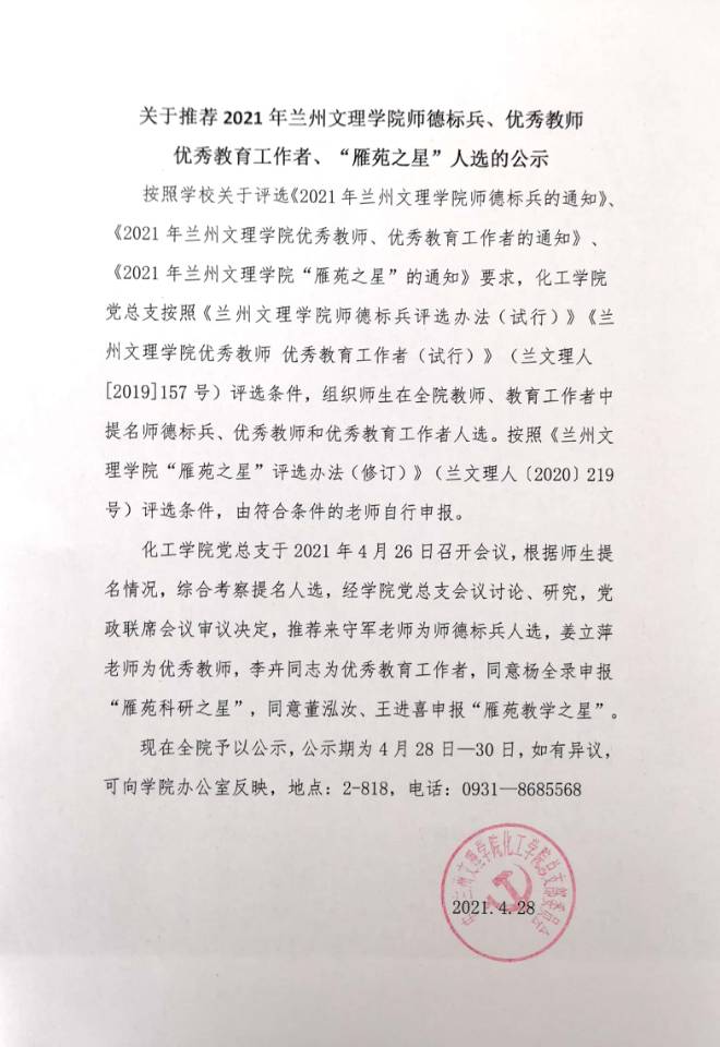 关于推荐2021年伟德体育官方网站师德标兵、优秀教师、优秀教育工作者、“雁苑之星”人选的公示