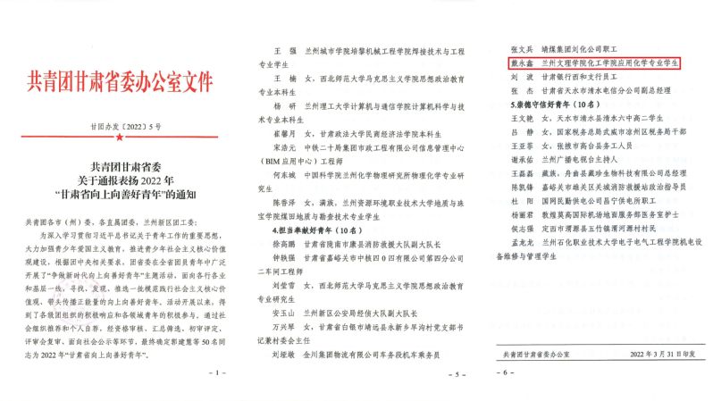 近日,团省委组织开展全省“向上向善好青年”推选活动,校团委积极组织开展校级推评活动。经过资格审查、汇总筛选、初审评定、评审会复审、面向社会公示等环节,最终确定50名2022年甘肃省“向上向善好青年”。公司2019级化学专业2班戴永鑫同学荣获“担当奉献好青年”。