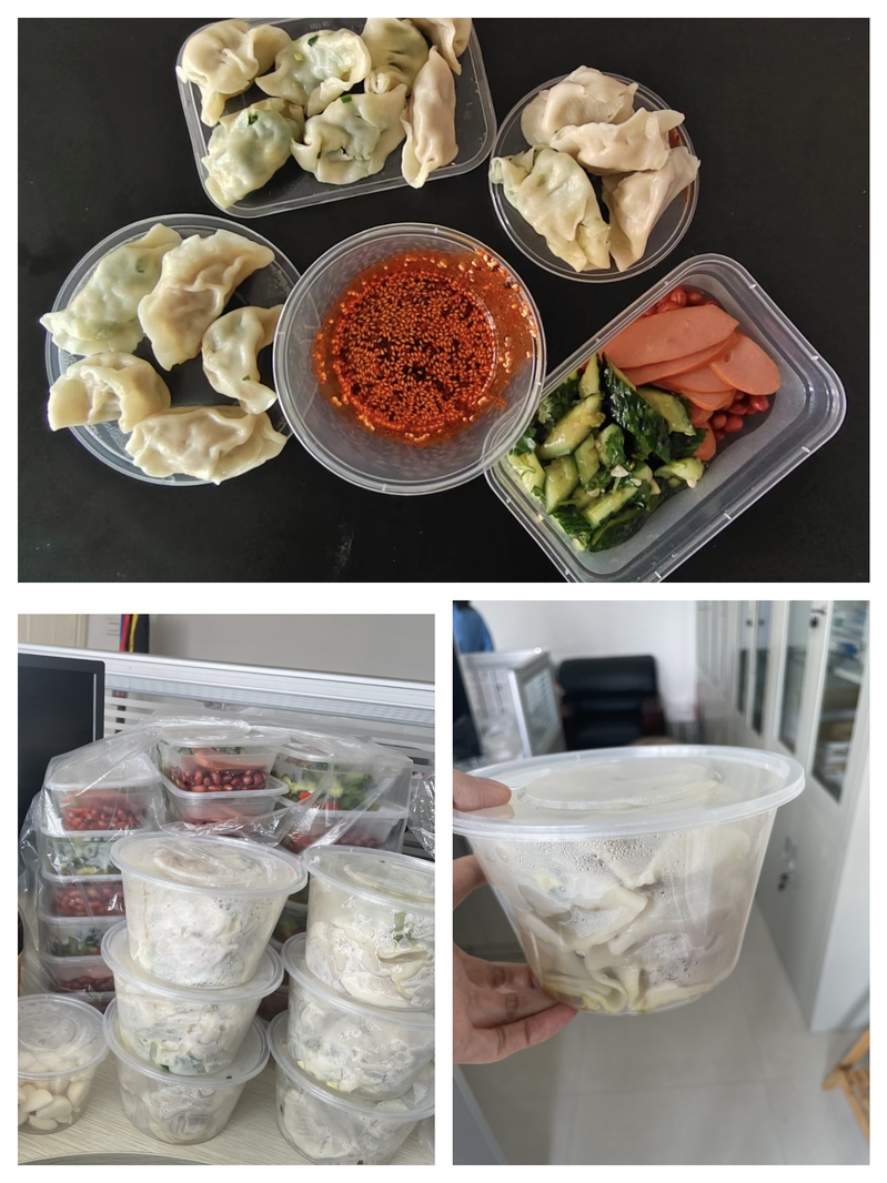 王子宜、董泓汝两位老师一大早就去菜市场买肉、买菜,马不停蹄的绞肉、洗菜、切菜、拌馅,从备菜、包饺子、煮饺子、装盒都驾轻就熟。陈倩老师包饺子又快又漂亮,王尹杉老师油泼辣子香气四溢,凉拌小菜精致又好吃。四位老师忙忙碌碌一个早上,包了韭菜鸡蛋、萝卜肉、芹菜肉、白菜肉、香菇肉五种馅六百个饺子。当一个个饱含“爱”的饺子出锅、装盒,被送往每个坚守岗位的老师手上时,四位老师才松了一口气,才有时间看微信群里老师们的留言。