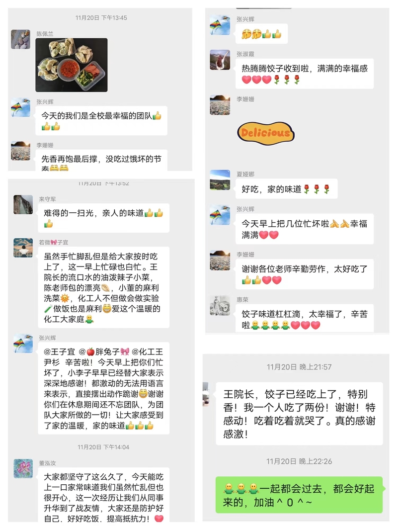 在校老师们纷纷在微信群发信息,感谢四位老师的辛苦付出,让大家深深感受到了“家”的温暖和幸福的味道。小小的饺子,饱含老师们之间浓浓的情谊,也大大的增强了留校坚守的教师们的幸福感。