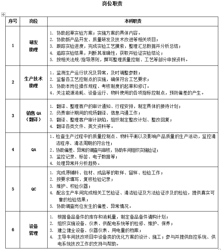 分析检验、药物分析、生物制药、微生物相关专业,熟练掌握分析化学基本操作,熟悉仪器设备操作及维护。