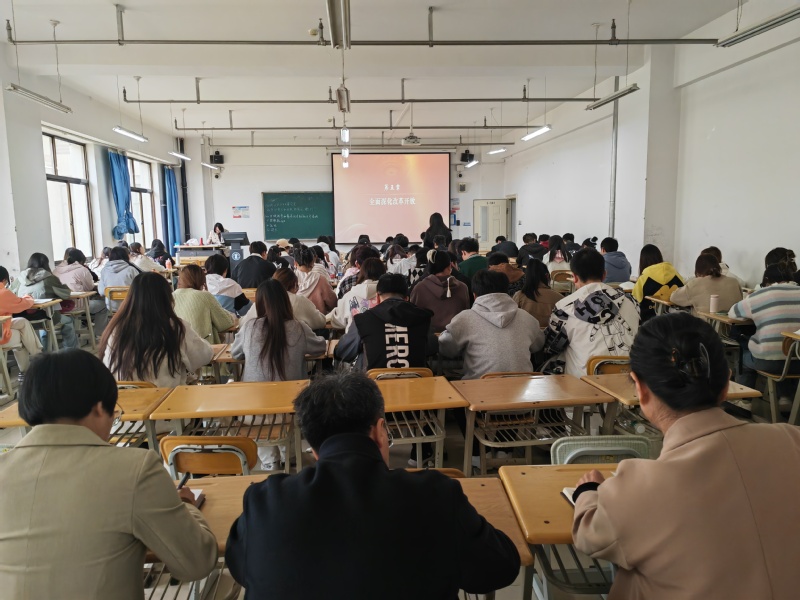 在课堂上,马克思主义公司谢晖老师为同学们讲授《习近平新时代中国特色社会主义思想概论》第五章的内容,就为什么全面深化改革开放和怎样全面深化改革开放进行讲解。师生精神状况良好,课堂秩序井然。