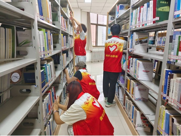 活动中,志愿者们化身“图书整理员”,用行动诠释劳动之美,他们穿梭于书架间,按图书类别、作者、出版年份逐一核对排序,将错位书籍精准归位,让原本杂乱的书架变得整齐划一;手持清洁工具细致擦拭书架,清除灰尘与污渍,为读者营造干净舒适的阅读环境。经过志愿者的努力,图书馆的藏书区域变得整齐有序,显著提升了读者查找图书的效率。